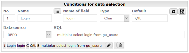 - added in section Conditions for data selection field definied as a list (you must set Datasource and SQL fields) - if You write in field SQL phrase mulitple: then definied as multiple choice lists, for example: