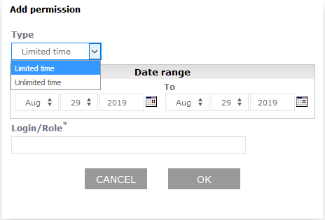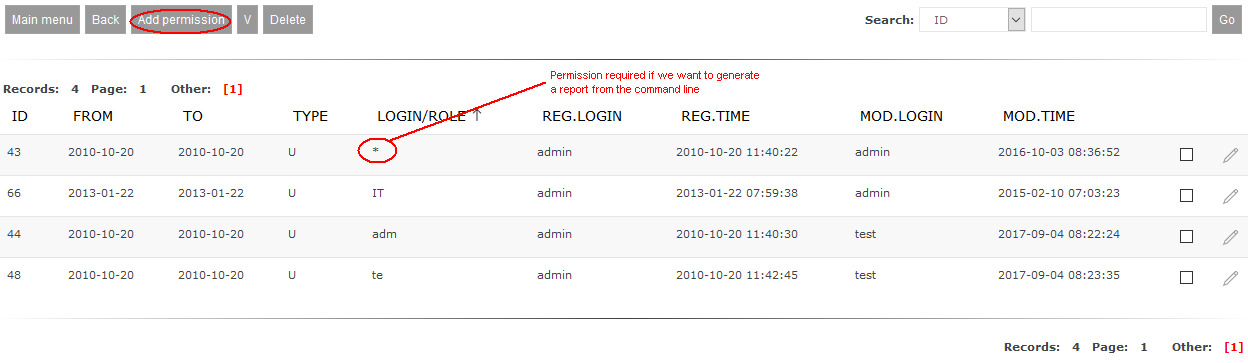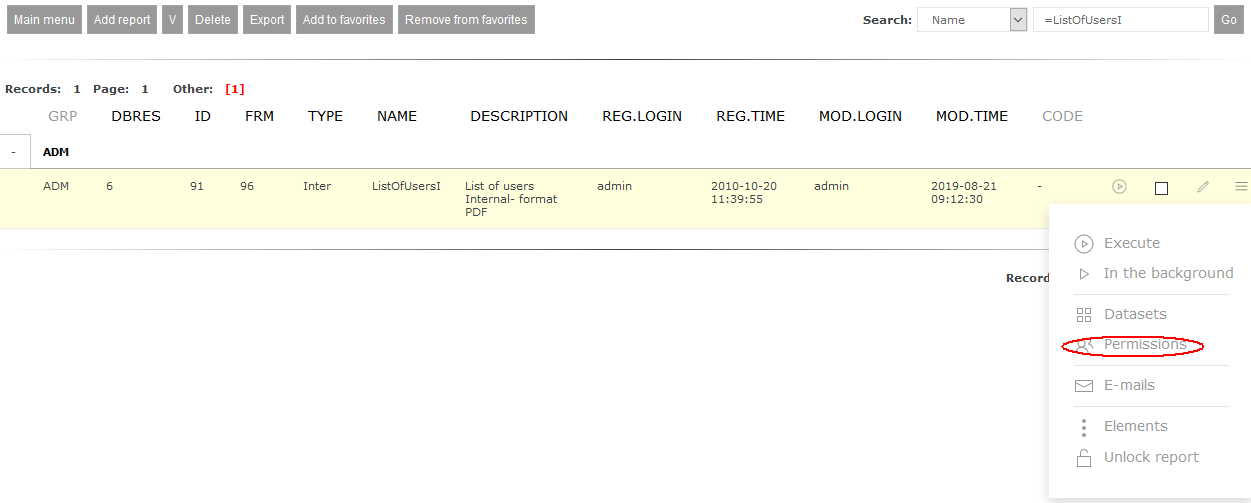 Adding access rights to a reportAccess rights to a report are added using report list (Reports->List of reports) and then from report's menu by choosing option Permissions: ![]() Next you have to move to list or access registered for the report: ![]() Adding new right is done by function Add permission. After selecting it the form allowing registering new access right will be shown: ![]() System allows to register following rights: