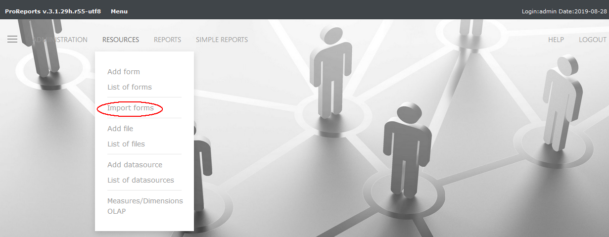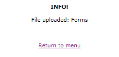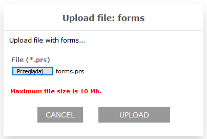 Importing formImporting a form from file is available in menu Resources->Import forms: ![]() Selecting this option will bring up form that allows choosing file will forms to import: ![]() After clicking Upload process will start. After positive result you will be shown following information: ![]() Imported forms can be found in Resources->List of forms entering in field Search value Name and in condition field entering value - (dash): ![]() As you can see, after importing a form it has attached random value. It is to prevent repeating form names. Random postfix needs to be removed from form name. Form imported this way need to be compiled (here you can learn how to do it). This page may have a more recent version on pmwiki.org: PmWiki:ImportFormsRej, and a talk page: PmWiki:ImportFormsRej-Talk. |