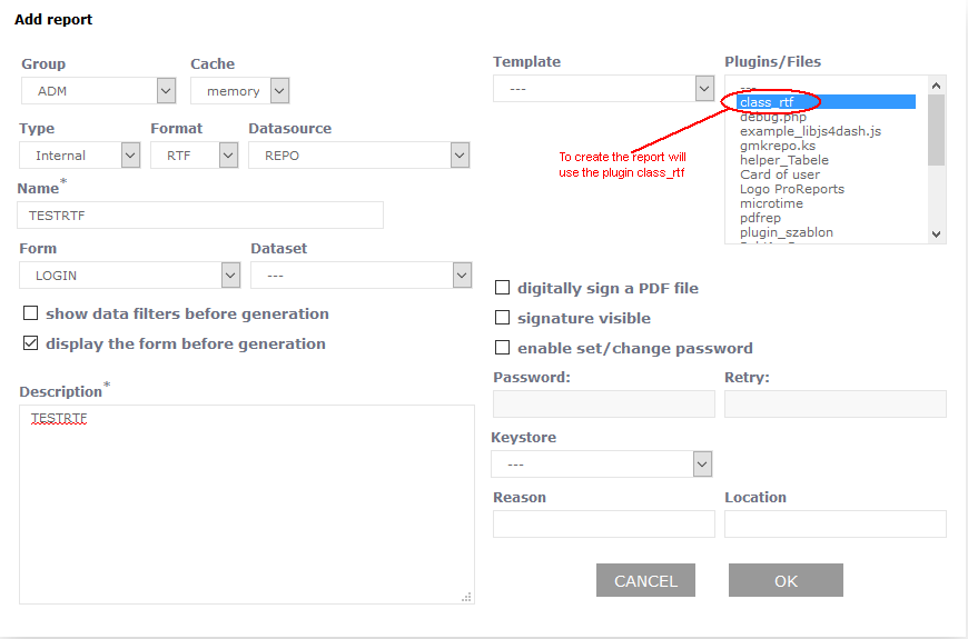 In example was used plugin class_rtf.php which makes it much easier to create RTF documents. First step is to register report using prepared earlier [FormsRej|form]] LOGIN. When registering using plugin list (Other files) we choose plugin class_rtf.php: ![]() Next we register elements of a report. Report example - option A