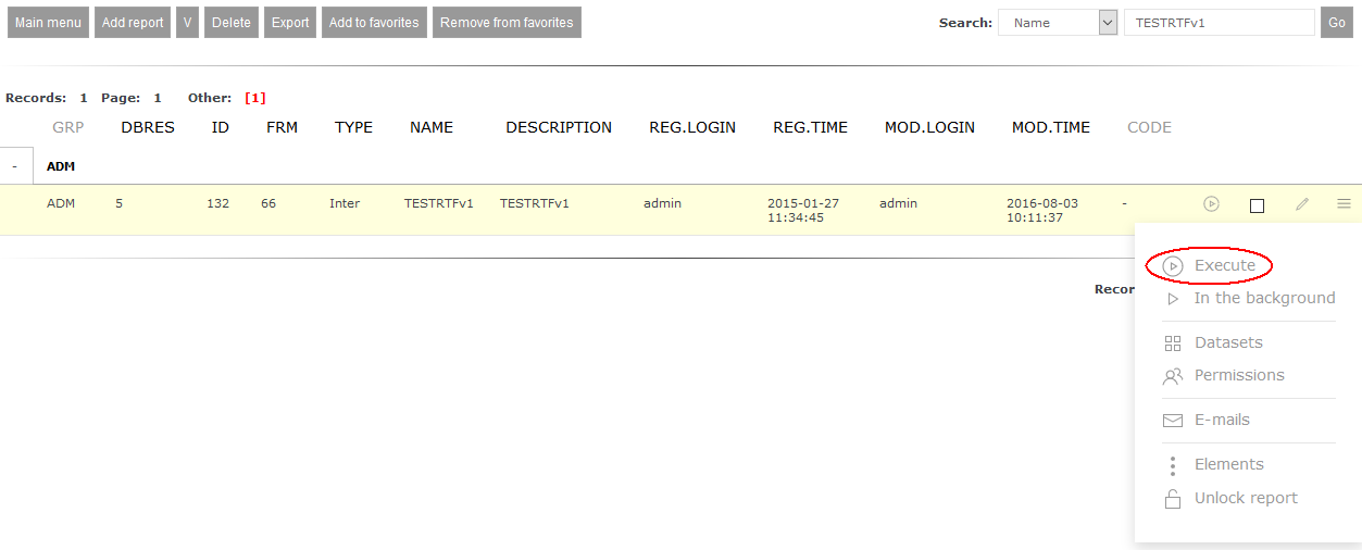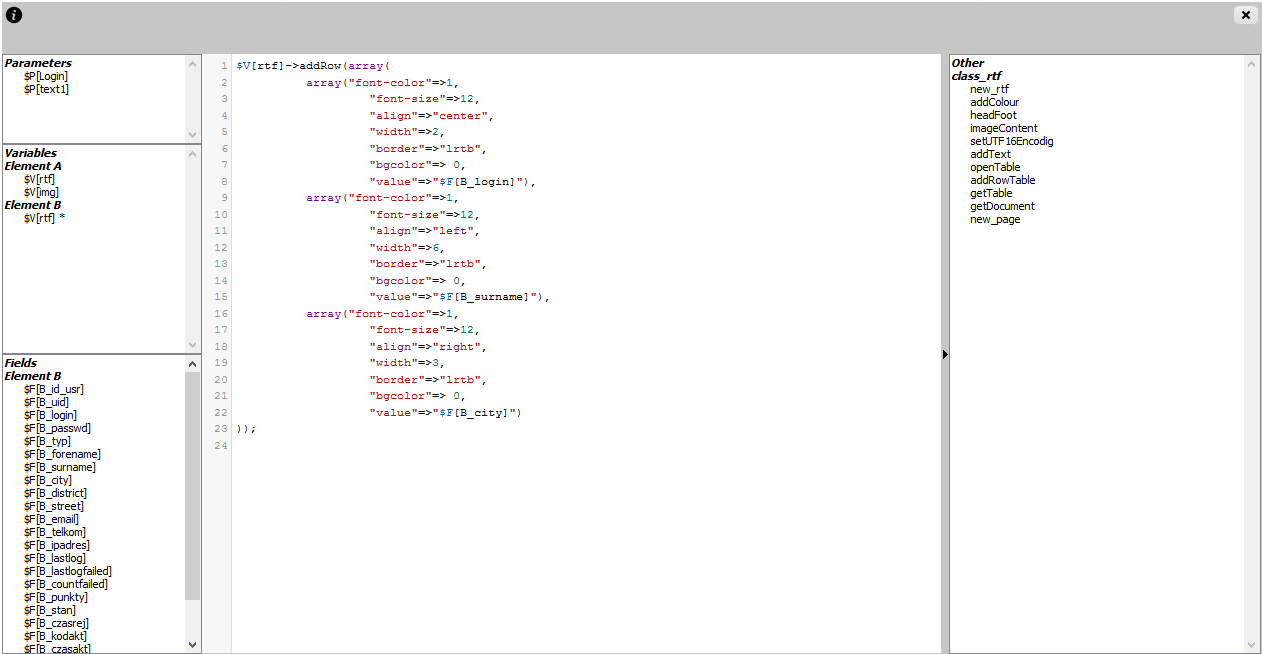 At this point the table is being closed and added to document: $V[rtf]->closeTable(); $V[rtf]->addText($V[rtf]->getTable() ."<BR>"); At the end of RTF document we have to assign to variable $V[out]: $V[out]=$V[rtf]->getDocument(); that needs to entered in section Template. While generating a report as a result of elements processing value on variable $V[out] (and RTF document aswell) is passed to output file of a report saved as *.rtf file. Report example - option BAs you can see this report isn't very complex. Despite that definitions of element are quite complex (especially section Expresion/Code before Template). To avoid this we can overwrite for our report some custom report plugin PHP and most of element definitions move inside this plugin. Report will gain more readability and versatility. Report can be edited and from list of used plugin you need to unmark class_rtf.php plugin, because it will be imported in basic plugin. Here is the code of mentioned plugin testrtfv2.php: