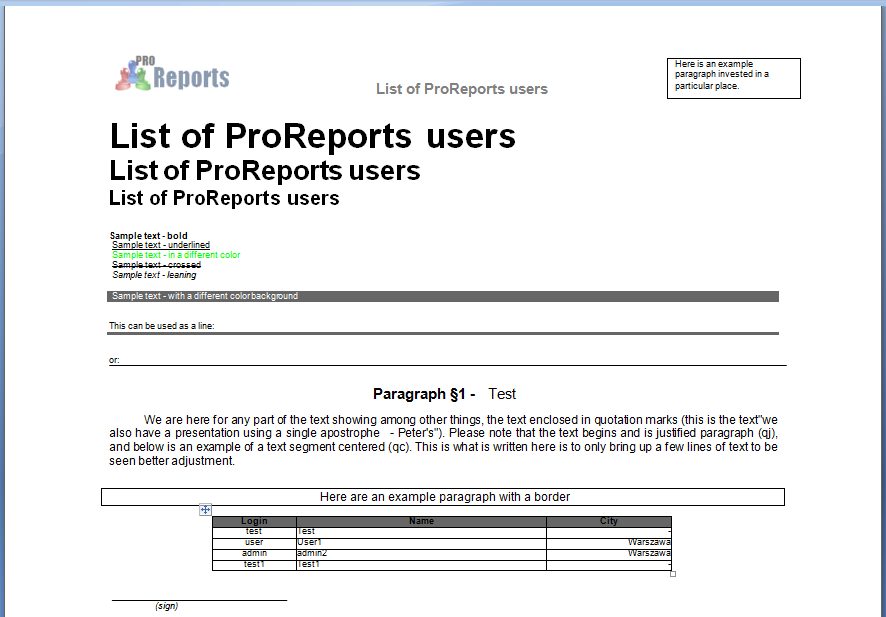 We want to create simple report, that basing on internal ProReports database wil generate *.rtf file with table filled with users. Additionally report will be presenting other possibilities related to RTF documents: