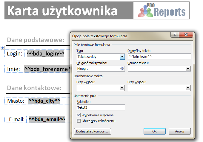 ExamplePrepare templateTemplate *.rtf is a regular file, the fields download from a data source must be inserted as form text fields (see below): ![]() format: Attach templetePrepared template attach to the reporting system like other auxiliary files (look here). Create a report with an indication of the reporting system prepared templateWe register report indicatiing in field Template previously imported template *.rtf. ![]() Next We register elements of report: