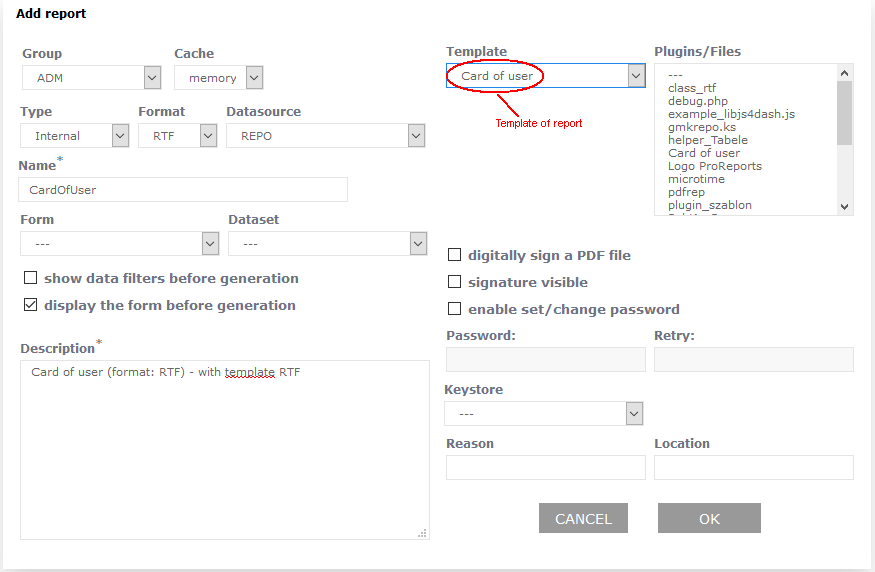Internal report based on RTF templateDownload template RTF karta.rtf In system ProReports it is possible to prepare a report based on the template file *.rtf. This type of report can be useful for creating different types of contracts, annexes, applications, print postage, etc. Creating such a report you have to make tree steps: